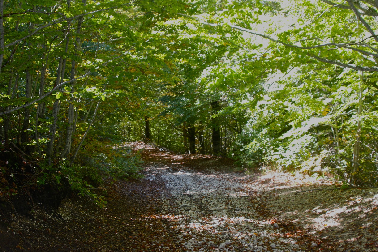 The above picture is important as you can see the short route to return to your starting point in the mid right portion of the photo. If you are using Gillian Price's guide book "Italy's Sibillini National Park-Walking and Trekking Guide" you will see on the map an inverted "v" in the trail which skirts Colle del Lupo, located below Mt. Macchialta. When you get to the apex of that "v" if you turn right at the T crossing instead of left which takes you into the beech forest below, you will arrive at the trail to take you back on the other side of the crest you walked under to arrive here and avoid the majority of the distance this hike requires.
